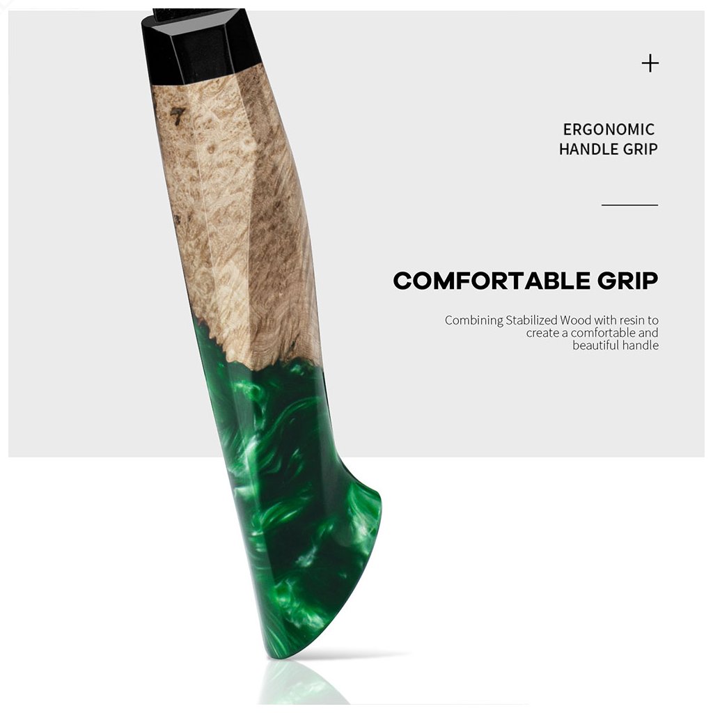 Der Griff besteht aus einer Kombination aus stabilisiertem Holz und grünem Harz. Dieses Material wurde aufgrund seiner Festigkeit, Feuchtigkeitsbeständigkeit und optischen Attraktivität ausgewählt. Es bietet einen bequemen, sicheren Griff und eine Ausgewogenheit, die sowohl Hobbyköche als auch Profis zu schätzen wissen. Die Form des Griffs sorgt für einen natürlichen und sicheren Halt, der sich unabhängig vom Schneidestil an die Handfläche anpasst. Der Griff rutscht nicht, drückt nicht in die Hand und ermöglicht eine präzise Kontrolle über die Klinge, auch bei längerer Arbeit in der Küche. Diese Form ist besonders bei Messern japanischer Art beliebt, bei denen Wert auf Ausgewogenheit und Gefühl beim Schneiden gelegt wird.