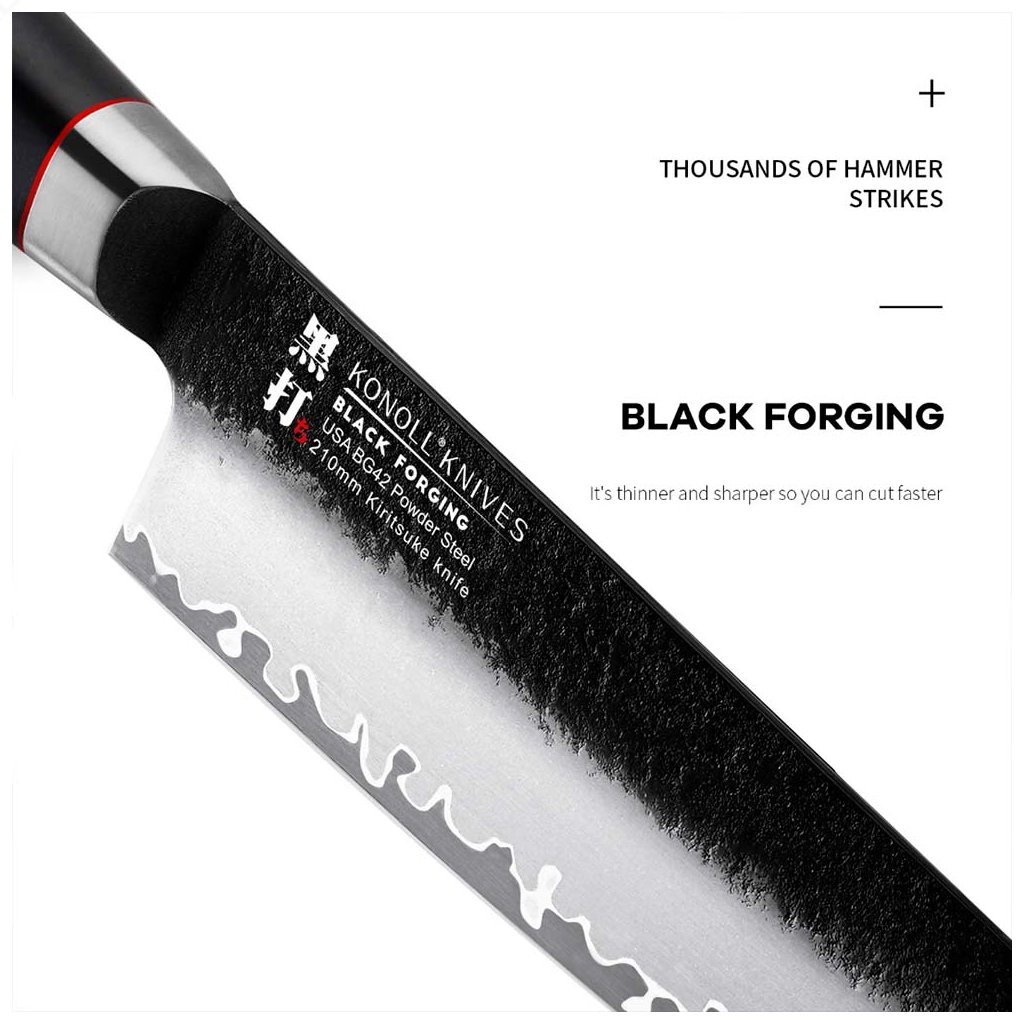 Die Messer der Serie KONOLL Black Forging sind optisch beeindruckend und liegen sowohl für Rechts- als auch für Linkshänder gut in der Hand. Jeder Koch wird nicht nur ihr außergewöhnliches Design, sondern auch die perfekte Ergonomie des westlichen ovalen Griffs zu schätzen wissen.