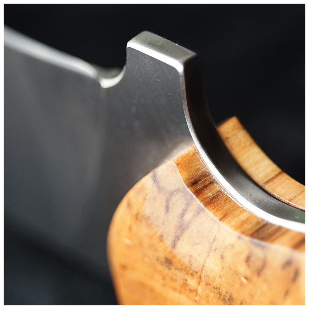 Dieses Messer ist vor allem zum Zerteilen und Schneiden von Fleisch bzw. zum Abziehen von Wild bestimmt. Es ist ein wichtiges Werkzeug für das Leben auf Bergweiden, aber auch unerlässlich für Schlachthöfe, Metzgereien und Restaurants. Seine Hauptfunktion besteht darin, Fleischstücke von Knochen zu trennen, Haut und Fett zu entfernen und große Fleischstücke in kleinere Stücke zu zerteilen. Das Dellinger Butcher Poplar D2 Metzger-/BBQ-Messer ist geschmiedet und aus zähem D2-Stahl gefertigt, dessen Härte Rockwell 58-60 (HRC) beträgt. Es ist das ideale Werkzeug zum Hacken, Schneiden und Überleben in der Wildnis. Der wunderschöne Griff dieses Messers ist handgefertigt aus einem Stück stabilisiertem Pappelmaserholz. Die Einzigartigkeit dieses Messers liegt darin, dass es handgefertigt aus hochwertigem D2-Stahl ist. Dieser Stahl garantiert Langlebigkeit, Schärfe und Präzision, die Sie bei jeder Anwendung zu schätzen wissen werden. Das Dellinger Butcher Poplar D2 Metzgermesser ist der perfekte Helfer bei der Zubereitung von Fleisch und gleichzeitig eine tolle Designergänzung für Ihre Küche.