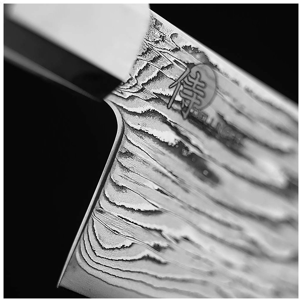 The blade core is made of Damascene steel with a hardness of 61±1 HRC, surrounded by 66 layers of two types of stainless steel. This layering ensures maximum toughness and durability. Raw pattern of hand-forged damascus. The uncooled, vivid surface with the distinctive pattern of the steel layers reveals the true character of the craftsmanship and gives each knife a unique identity. Precision workmanship guarantees easy maintenance and long-lasting sharpness, which can be easily restored by grinding on water stones.