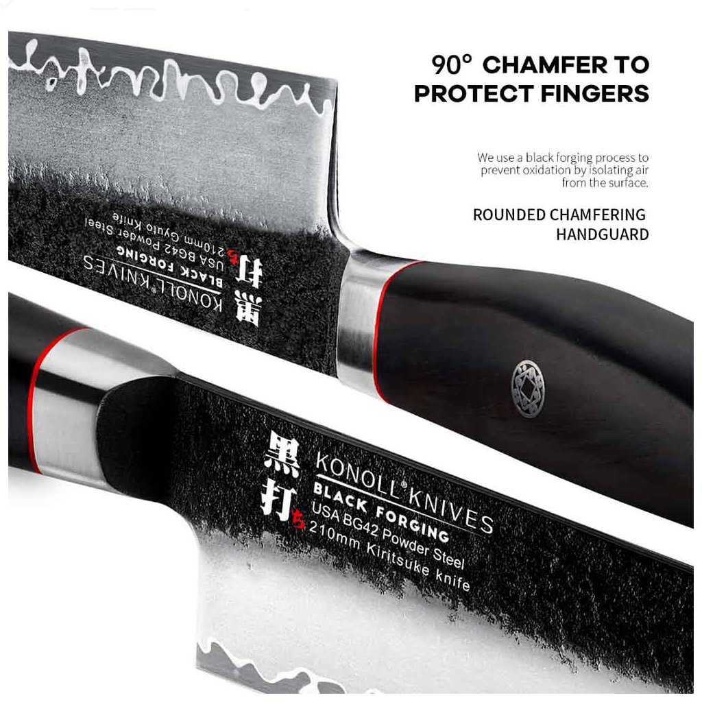 Nože ze série KONOLL Black Forging jsou vizuálně ohromující a skvěle padnou do ruky pravákům i levákům. Každý kuchař ocení nejen jejich výjimečný design, ale i perfektní ergonomii západní oválné rukojeti.