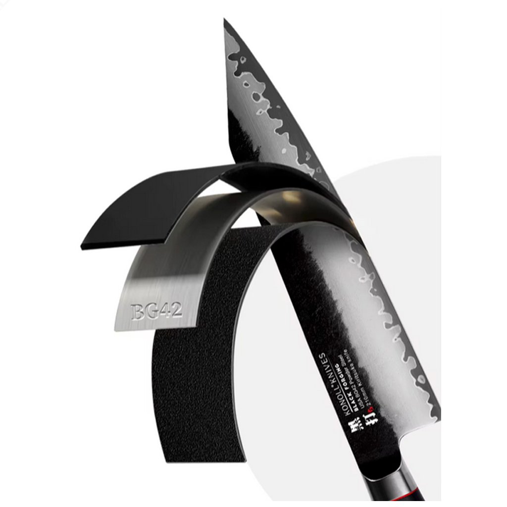 Čepele nožů Black Forging jsou ručně kované (hand forged) s jádrem z moderní práškové oceli BG-42, původem z USA. Tato kvalitní prášková ocel zajistí vysokou tvrdost, dlouhou výdrž ostří a stabilní řezné vlastnosti. Následné řízené tepelné zpracování zajišťuje optimální rovnováhu mezi ostrostí, odolností a houževnatostí čepele. Surový vzor ručně kované oceli. Neuhlazený, živý povrch s výraznou kresbou vrstev oceli odhaluje skutečný charakter řemeslné výroby a dává každému noži jedinečnou identitu. Precizní zpracování zaručuje snadnou údržbu a dlouhotrvající ostrost, kterou lze snadno obnovit broušením na vodních kamenech.