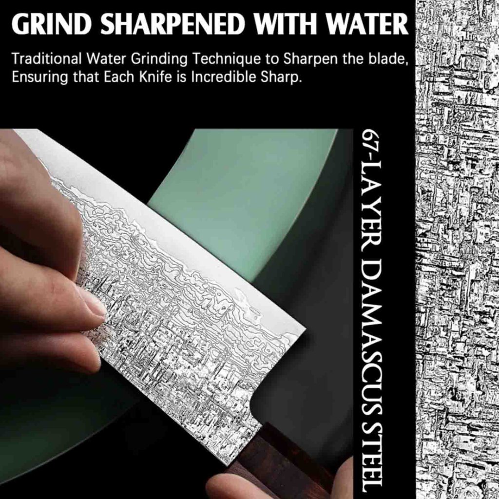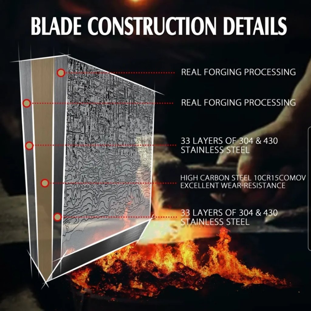 Jádro čepele je vyrobeno z damascénské oceli s tvrdostí 61±1 HRC, obklopené 66 vrstvami dvou druhů nerezové oceli. Toto vrstvení zajišťuje maximální houževnatost a odolnost. Surový vzor ručně kovaného damašku. Neuhlazený, živý povrch s výraznou kresbou vrstev oceli odhaluje skutečný charakter řemeslné výroby a dává každému noži jedinečnou identitu. Precizní zpracování zaručuje snadnou údržbu a dlouhotrvající ostrost, kterou lze snadno obnovit broušením na vodních kamenech.