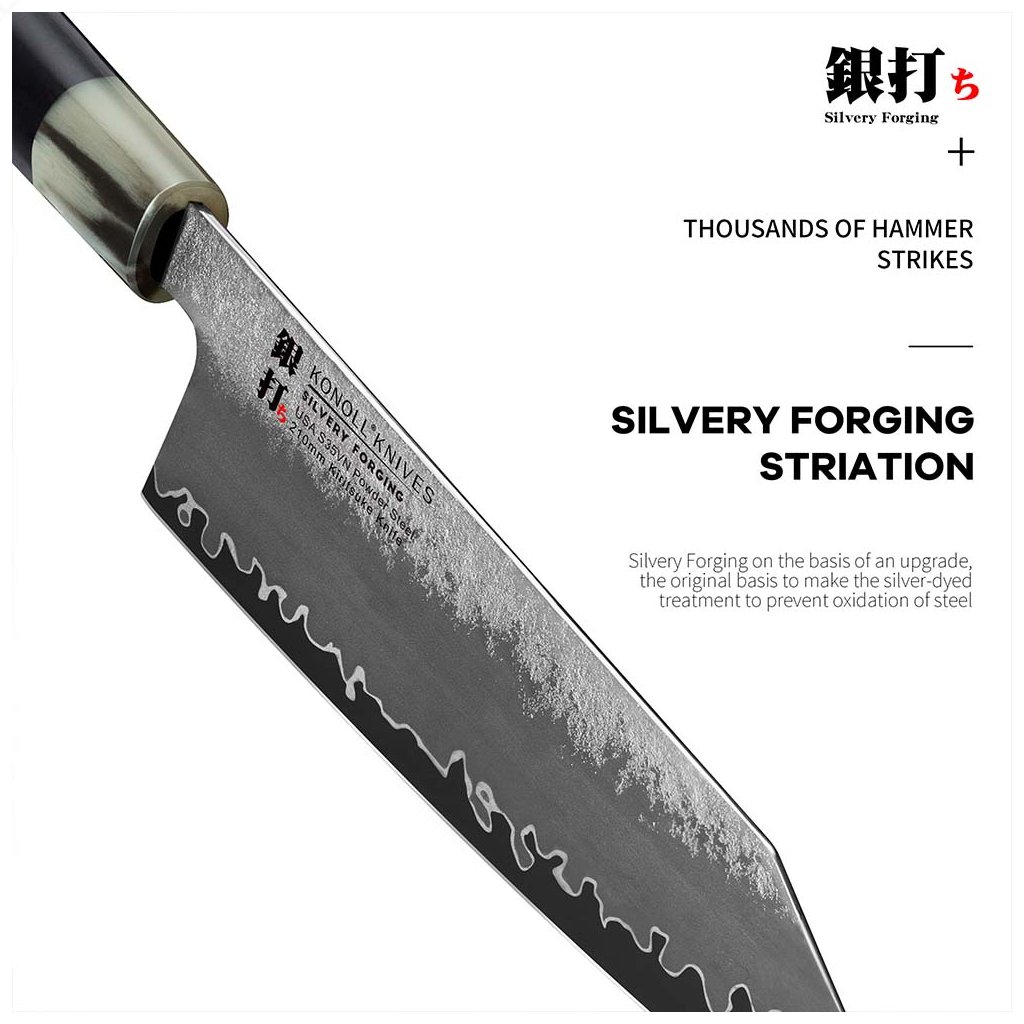 Nože ze série KONOLL Silvery Forging jsou vizuálně ohromující a skvěle padnou do ruky pravákům i levákům. Každý kuchař ocení nejen jejich výjimečný design, ale i perfektní ergonomii oválné rukojeti.