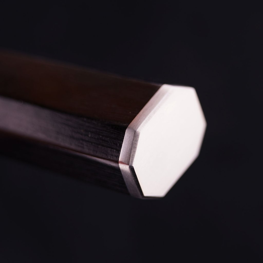 Elegantní rukojeť z černého pakka dřeva je navržena tak, aby dokonale padla do ruky – pocit „jakmile jej vezmete do ruky, už nepustíte“. Vyvážení těsně před bolsterem - plynulý přechod z kulatého tvaru u záštity do osmihranu na konci - ocelová koncovka pro pevnost a stabilitu. Tato kombinace zajišťuje komfort, jistotu a precizní kontrolu při každodenním profesionálním použití.