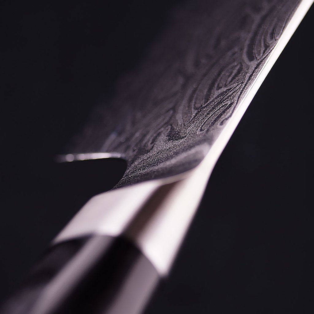 Čepel je zhotovena v typické damaškové konstrukci Sakai Takayuki (45 vrstev) a zdobí ji tradiční japonský motiv Seigaiha – modré mořské vlny, symbolizující věčnost, klid a prosperitu. Tato série přináší také inovovanou geometrii Vertical Thin Blade Spec – extrémně tenký výbrus minimalizující odpor při řezu. Nůž tak hladce klouže masem, rybami i zeleninou a umožňuje maximálně přesný, lehký a kontrolovaný řez. Precizní zpracování zaručuje snadnou údržbu a dlouhotrvající ostrost, kterou lze snadno obnovit broušením na vodních kamenech.