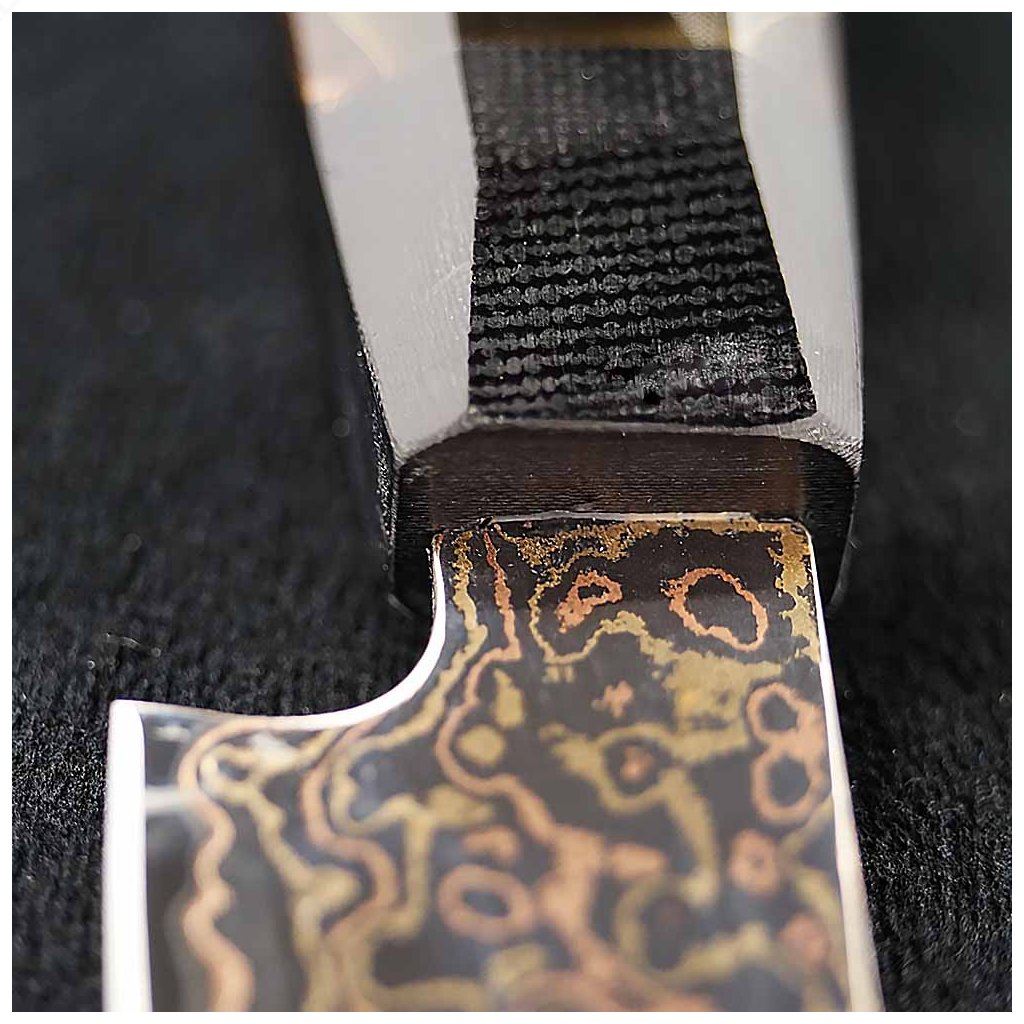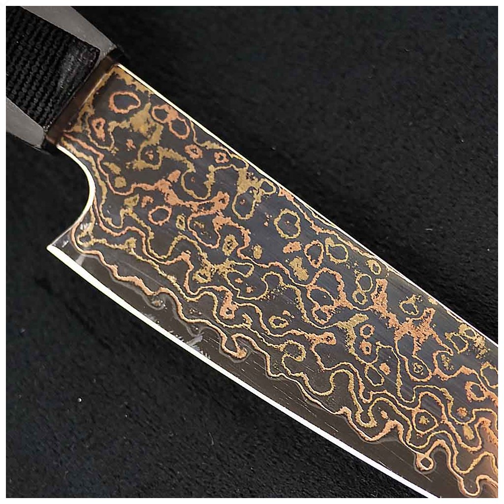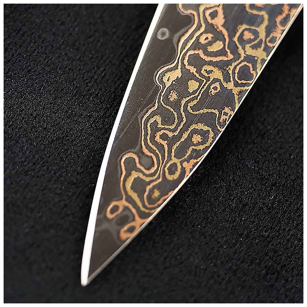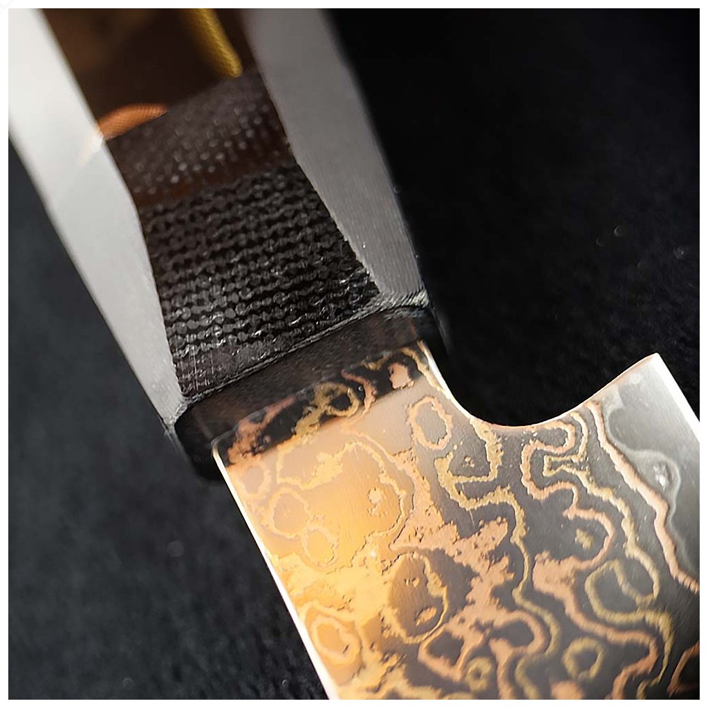 Nože vyrobené ze sendvičové damaškové oceli s vrstvami cuprum (mědi), které spojují špičkové funkční vlastnosti moderních materiálů s jedinečným vizuálním charakterem. Každá čepel je výsledkem precizního technologického procesu, kde má každý materiál přesně danou roli.