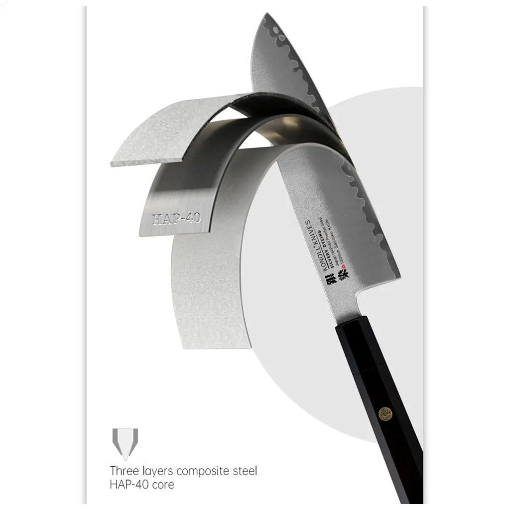 Ostrza Silver Dyeing są produkowane jako trójwarstwowa stal kompozytowa z rdzeniem z japońskiej stali proszkowej HAP-40, która zapewnia wysoką twardość (66 HRC) i wyjątkową odporność na zużycie. Dzięki temu ostrze długo zachowuje ostrość i zapewnia czyste, precyzyjne i płynne cięcia – idealne do szerokiego zakresu zadań kuchennych, od krojenia warzyw po przygotowywanie mięsa i ryb.