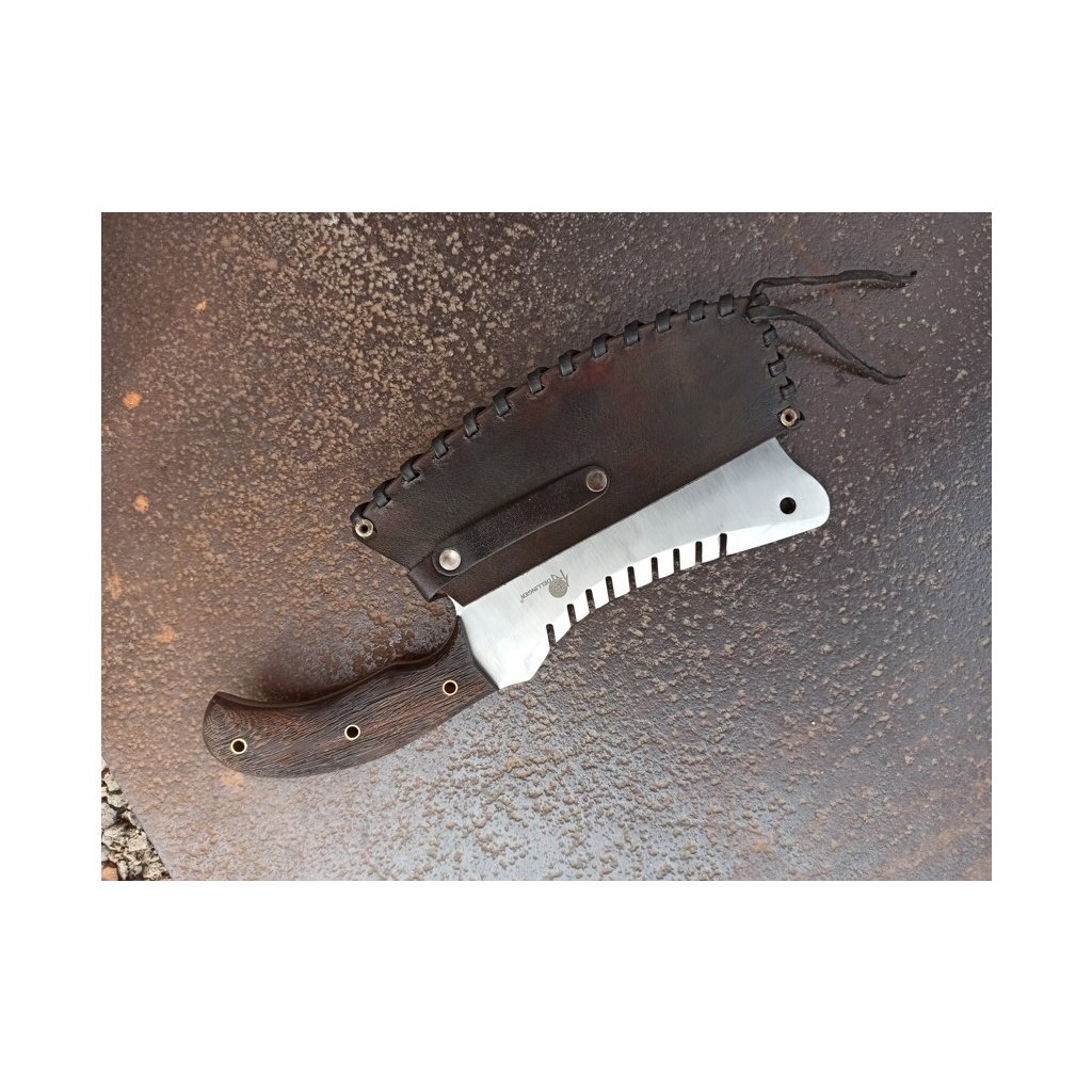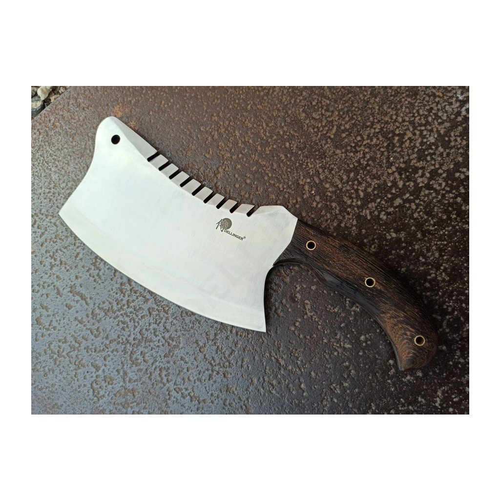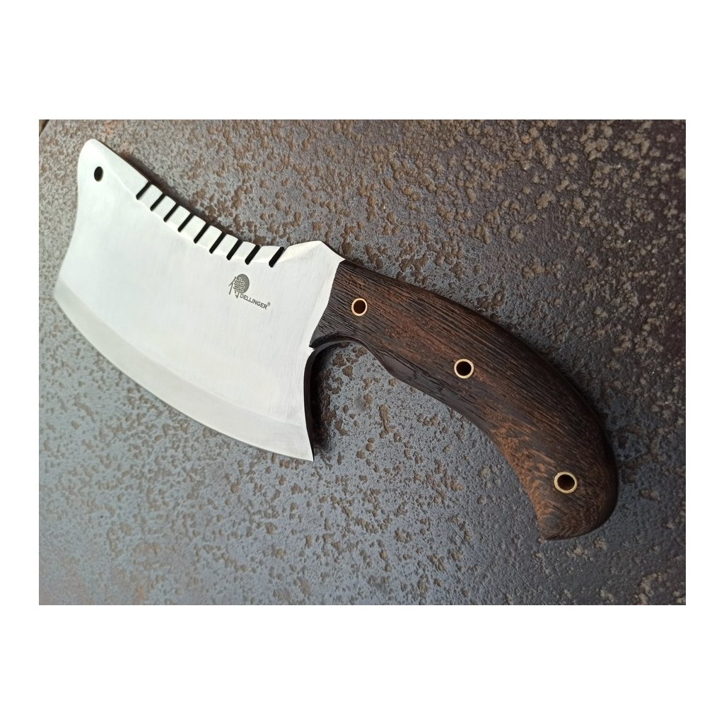Tento výkonný nástroj je ručně kovaný a zpracovaný z oceli D2. Po přesném a pečlivém vytvrzení, temperování a žíhání dosahuje tvrdosti HRC 60-62. Jeho ostří jen tak někdo, nebo něco nepoškodí. Nádherná rukojeť tohoto sekáčku je ručně tvarována z kusu afrického tvrdého dřeva Wenge, které je olejováno Tungovým olejem a voskováno včelím voskem. Duté kolíky jsou vyrobeny z mosazi.