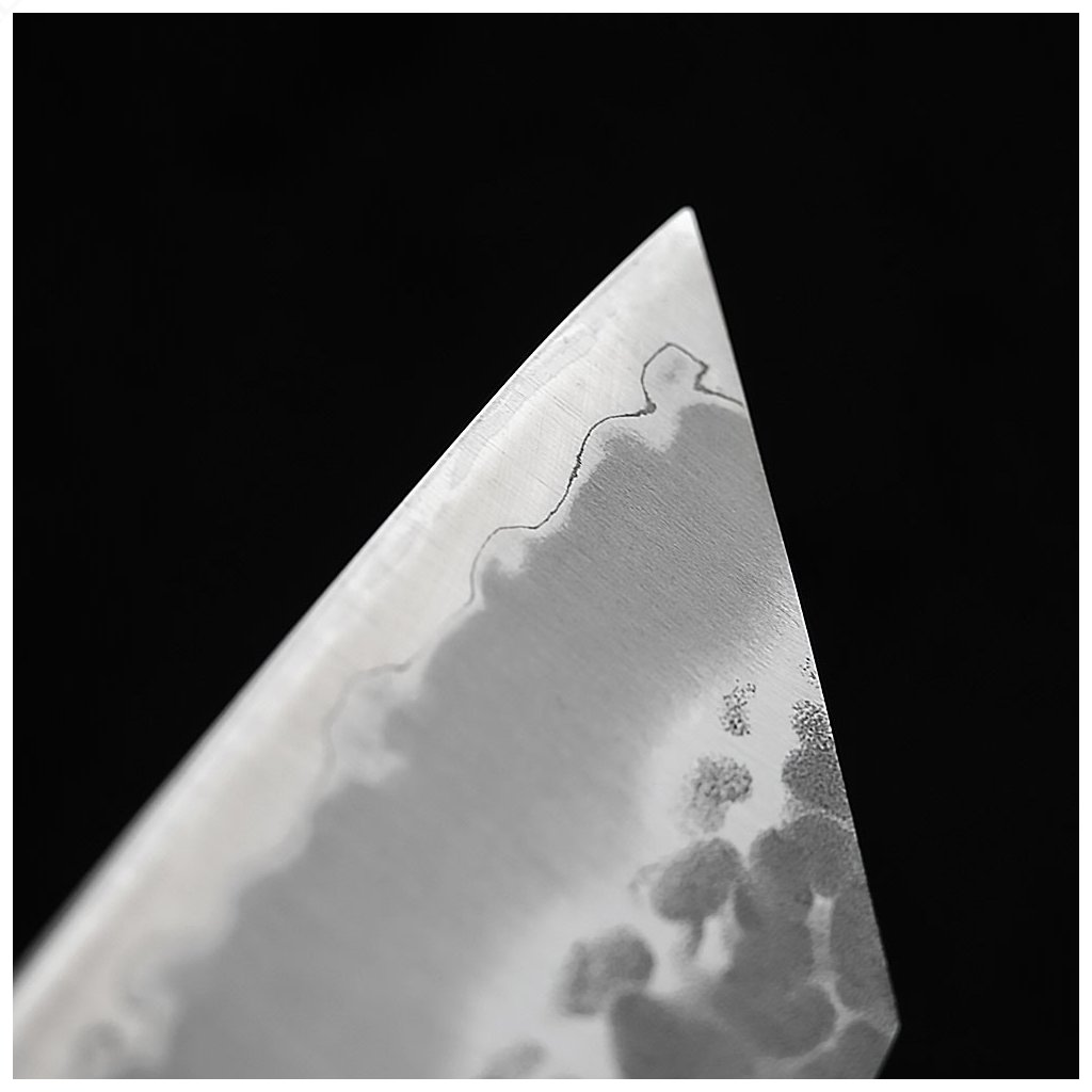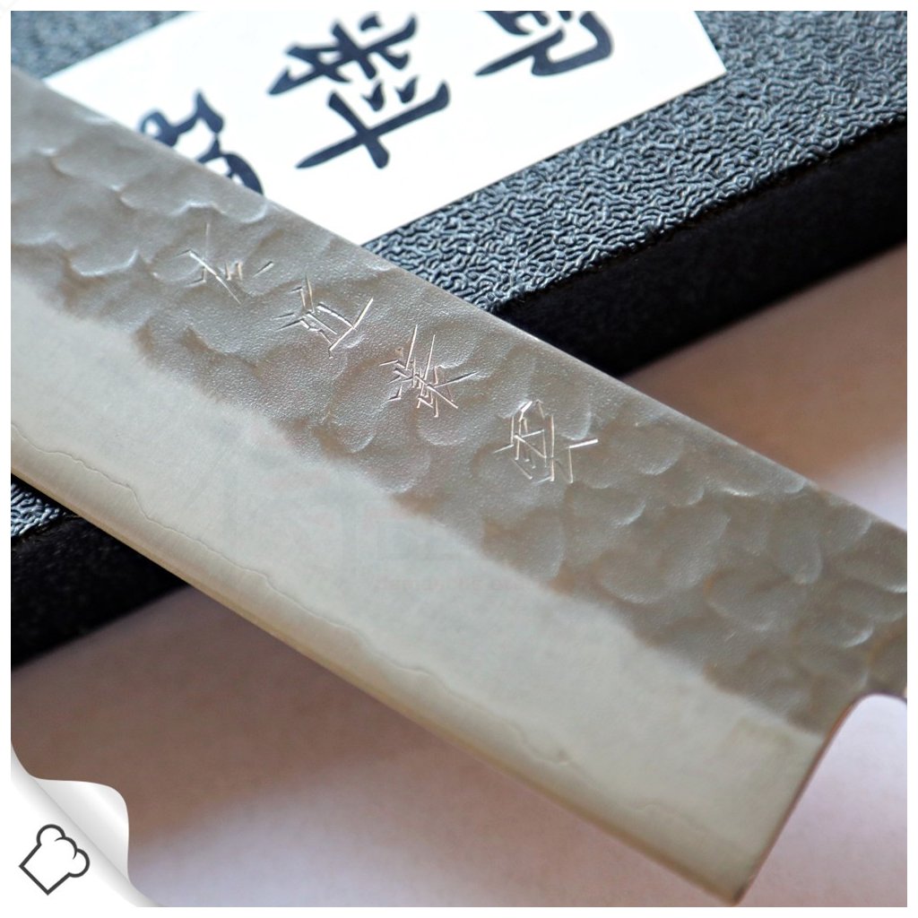 Robustný, ostrý japonský nôž Kiritsuke/Gyuto zo série Hokiyama Tosa-Ichi Tsuchime Bright, vyrobený z japonskej ocele AOGAMI SUPER (Blue Super Steel). Chrbtica noža a čepeľ sa zužujú do špičky, čo umožňuje všestranné použitie, napríklad na krájanie a čistenie mäsa, ovocia a zeleniny. Kuchársky nôž je vhodný aj na krájanie byliniek, zeleniny a orechov. Perfektne vyvážená čepeľ s Tsuchime (kovanou) povrchovou úpravou nielenže dodáva nožu skvelý vzhľad, ale tiež zabraňuje prilepeniu krájaného materiálu na čepeľ. Ostrá čepeľ zaisťuje minimálnu stratu tekutiny a vaše jedlá budú plné šťavy a vitamínov. Japonské umenie a nové technológie robia tento nôž jedinečným a nenapodobiteľným.