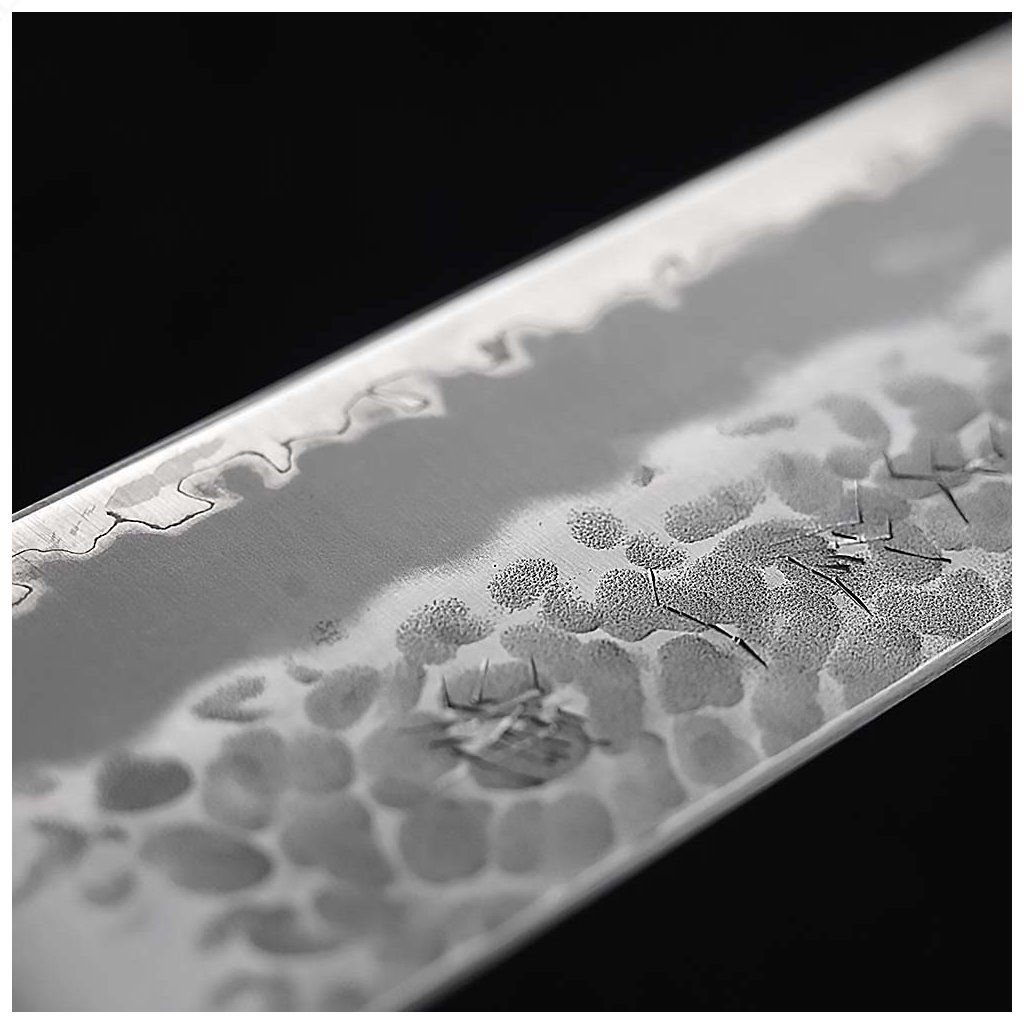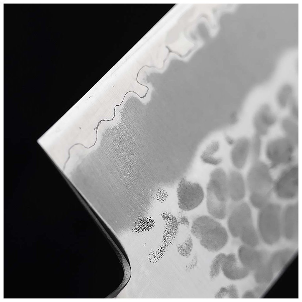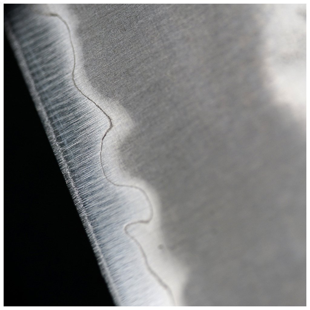 Oceľ Aogami Super je mimoriadne bohatá na obsah uhlíka, ktorý priamo ovplyvňuje tvrdosť čepele. Obsahuje tiež 0,4 % vanádu, ktorý oceli dodáva väčšiu húževnatosť. Aogami Super je považovaná za najmodernejšiu uhlíkovú oceľ na trhu. Oceľ s vysokým obsahom uhlíka si vyžaduje viac údržby, pretože sa na nej rýchlo vytvára ochranná patina, a ak sa po každom použití neutrie a nevysuší, vytvorí sa patina (hrdza). Hokiyama však tento problém vyriešila a trochu nám údržbu uľahčila. Dve vonkajšie vrstvy z mäkšej ocele SUS405 sú odolné proti korózii. Oceľové jadro Aogami Super je stále odhalené na samom okraji (viditeľná zakrivená čiara v spodnej časti čepele predstavuje hranicu medzi jadrom a vonkajšími oceľami). Tvrdosť ocele Aogami Super je približne 63 HRC. Je to mimoriadne tvrdá oceľ, čo znamená, že si napriek intenzívnemu používaniu dlho zachováva vysokú ostrosť. Vďaka vysokému obsahu uhlíka sa nôž veľmi ľahko ostrí.