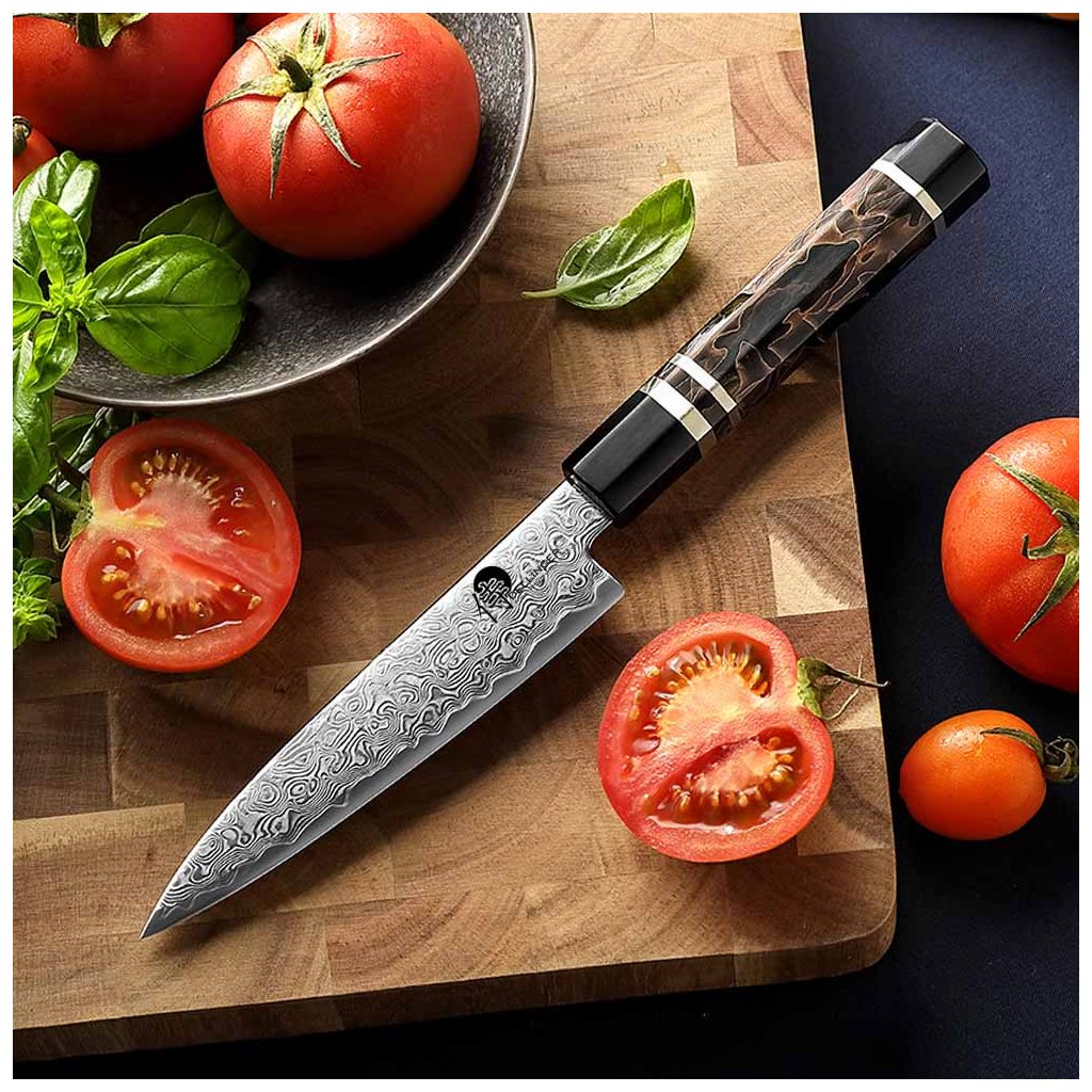 Objevte krásu a ostrost v jednom – nůž typu Utility s čepelí o délce 140 mm je ideální volbou pro precizní práci v kuchyni. Je vyrobený z vrstvené damaškové oceli s extrémně tvrdým jádrem z prémiové práškové oceli ZDP-189, která dosahuje tvrdosti až HRC 65–67. Díky tomu si nůž uchovává extrémní ostrost po dlouhou dobu a minimalizuje nutnost častého broušení. Každý kus je originál – čepel s 49 vrstvami damaškové oceli vytváří nádherný vlnitý vzor, který podtrhuje mistrovství zkušených nožířů. Rukojeť je vyrobena z luxusní stabilizované dřevo-pryskyřice, doplněná o elegantní prstence z pryskyřice a kovu. Šestihranný tvar rukojeti zajišťuje jistý a pohodlný úchop jak pro praváky, tak pro leváky. Tento univerzální nůž typu Petty je perfektní pro krájení ovoce, zeleniny, masa i ryb. Díky lehké konstrukci a tenkému profilu čepele zvládnete i ty nejjemnější řezy s maximální kontrolou a precizností.